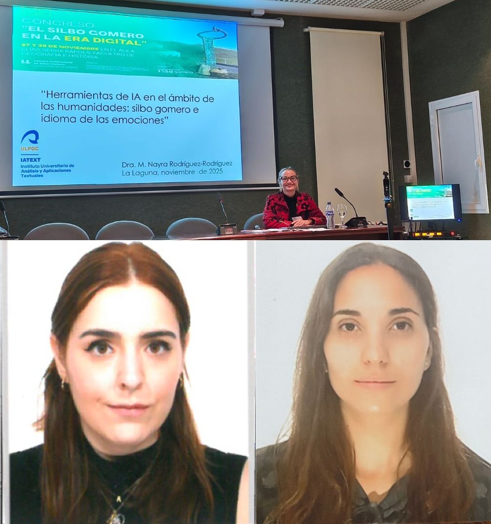 El segundo, el "Congreso Internacional del Silbo en la Era Digital: Seminario Internacional "Digitalización, IA y Salvaguardia del Silbo Gomero " expuso en una mesa redonda el análisis del idioma de emociones del español con herramientas de Inteligencia Artificial. Este Congreso congreso organizado por Grecy Pérez Amores y Ramón Hernández Armas es una iniciativa para el intercambio académico, la divulgación científica y la construcción de redes de colaboración entre investigadores y profesionales de disciplinas como la Antropología, el Arte, la Ligústica, la Historia, la Informática, la Literatura, la Ingeriría, entre otras. Tiene como objetivo principal generar un espacio de diálogo, reflexión y propuesta en torno al uso de las nuevas tecnologías aplicadas a la preservación, enseñanza y difusión del Silbo Gomero, lenguaje silbado tradicional de la isla de La Gomera (Canarias), declarado Patrimonio Cultural Inmaterial de la Humanidad por la UNESCO en 2009.
