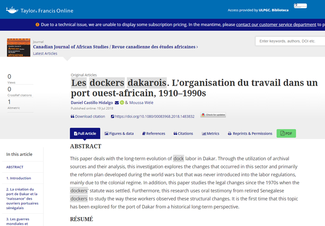 La Universidad de Las Palmas de Gran Canaria, y de forma específica el Instituto Universitario de Análisis y Aplicaciones Textuales (IATEXT), sigue profundizando en los estudios sobre el continente africano y el contexto marítimo regional. En este caso, acaba de publicarse en la Canadian Journal of African Studies, publicación de referencia en temas africanistas, el artículo “Les dockers dakarois. L´organisation du travail dans un port ouest-africain, 1910-1990s”, obra del investigador postdoctoral Daniel Castillo Hidalgo (División de Patrimonio e Historia Atlántica) y Moussa Wélé, doctorando de Historia en la Université Cheikh Anta Diop de Dakar. Este artículo ofrece una aproximación histórica pionera sobre la evolución institucional del trabajo portuario en el puerto senegalés empleando documentación original conservada en los Archivos Nacionales de Senegal. Además, el artículo introduce interesantes testimonios orales proporcionados por estibadores jubilados a partir del trabajo de campo realizado por los autores en 2016 y 2017. Un trabajo pionero en el que se pone de manifiesto la relativa plasticidad institucional colonial en lo referente a la gestión de la mano de obra portuaria, así como los conflictos sociales derivados de la configuración de la hegemonía colonial. El trabajo analiza también la evolución reciente del sector hasta la gran reforma portuaria de 1994 que supuso su liberalización en el contexto de los planes de ajuste estructural.