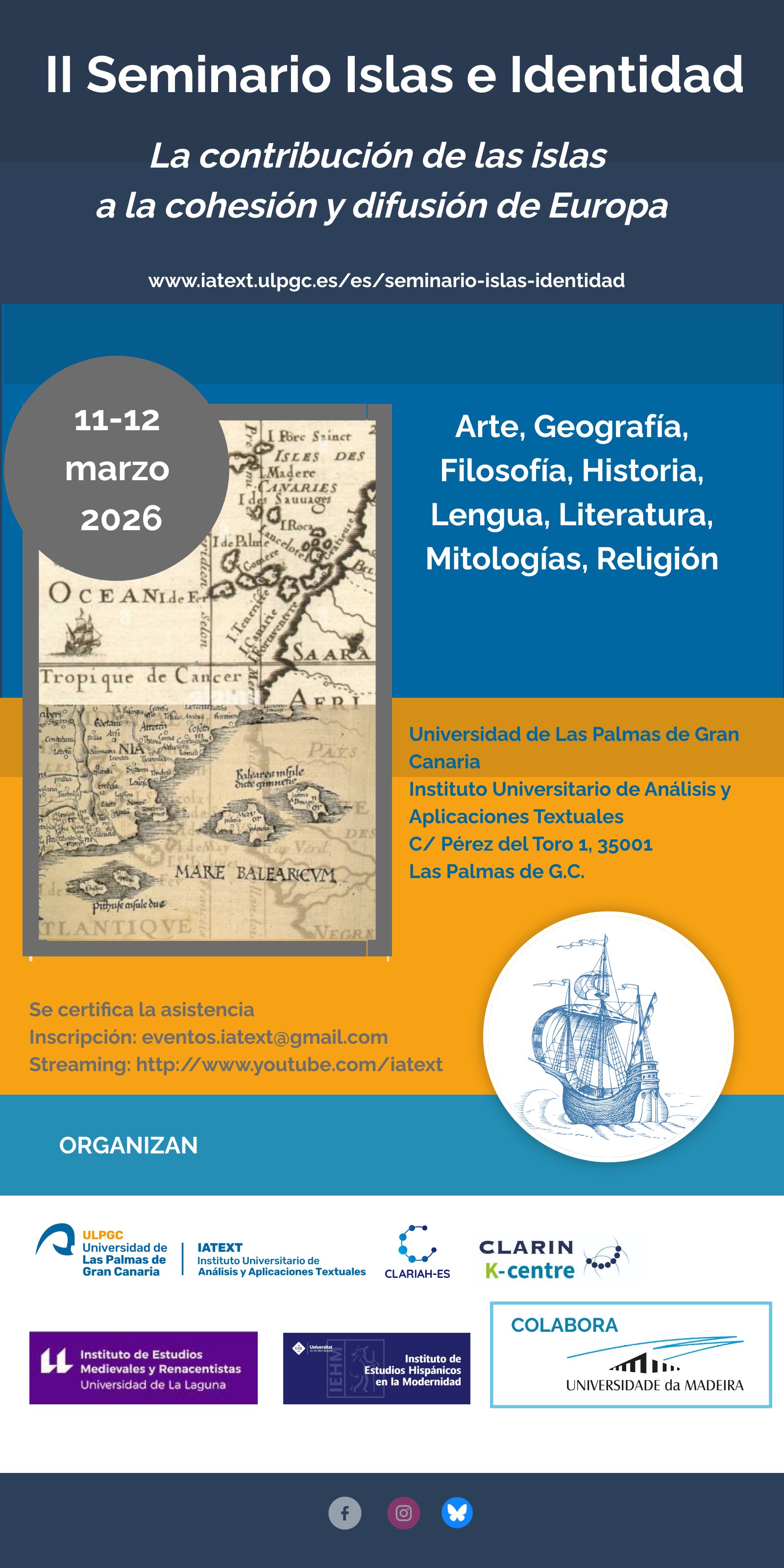 Del 11 al 12 de marzo de 2026 se celebrará en el Campus del Obelisco de la Universidad de Las Palmas de Gran Canaria el II Seminario Islas e Identidad: la contribución de las islas a la cohesión y difusión de Europa, organizado por el Instituto Universitario de Análisis y Aplicaciones Textuales de la Universidad de Las Palmas de Gran Canaria, el Instituto Universitario de Estudios Medievales y Renacentistas de la Universidad de La Laguna y el Instituto Universitario de Estudios Hispánicos de la Modernidad de la Universitat de les Illes Balears con la colaboración de la Universidade de Madeira.